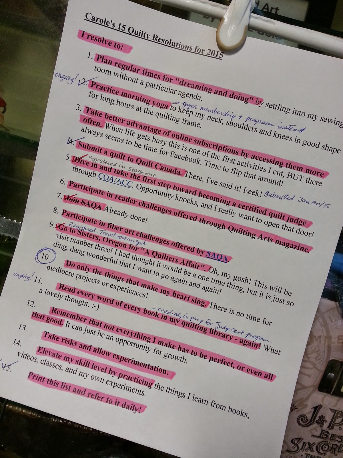 2. Congratulations on your entering a quilt for the contest, Carole! I love the way you described how you will feel regarding the outcome. Printing off your list and having it right there in front of you was a great idea. You sure have some wonderful goals picked out. And you are making headway on all of them. You go, girlfriend!
